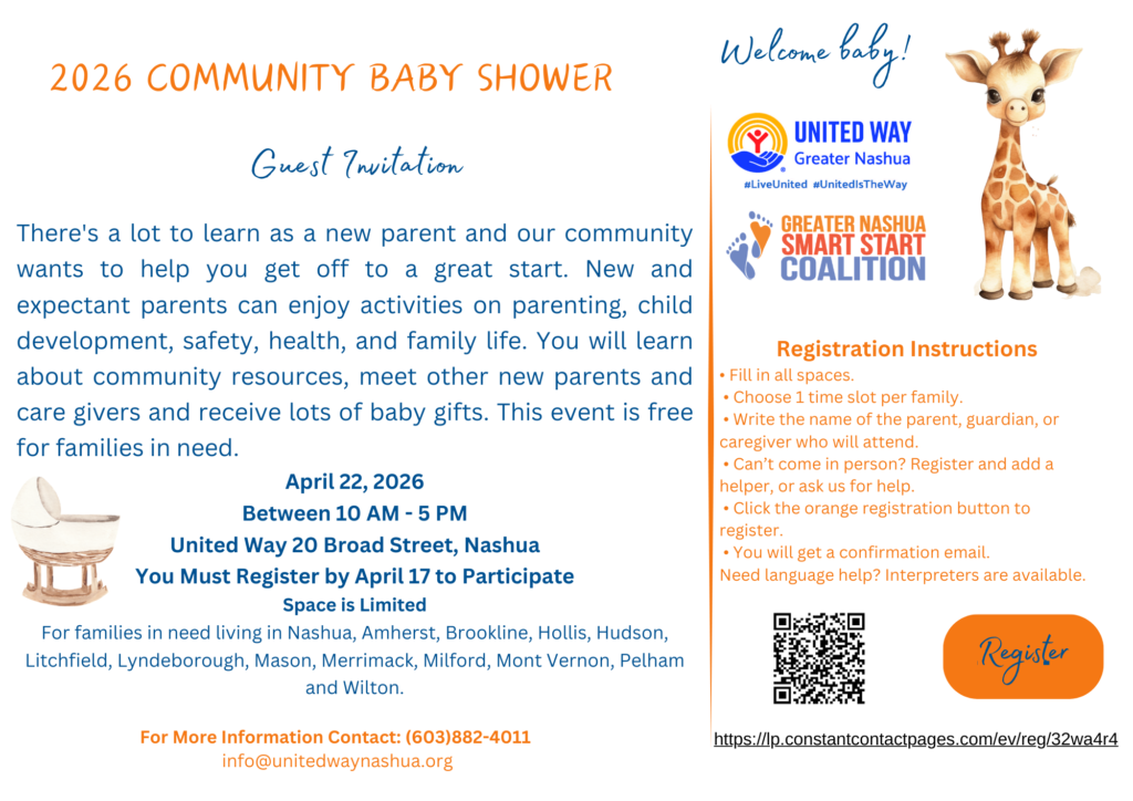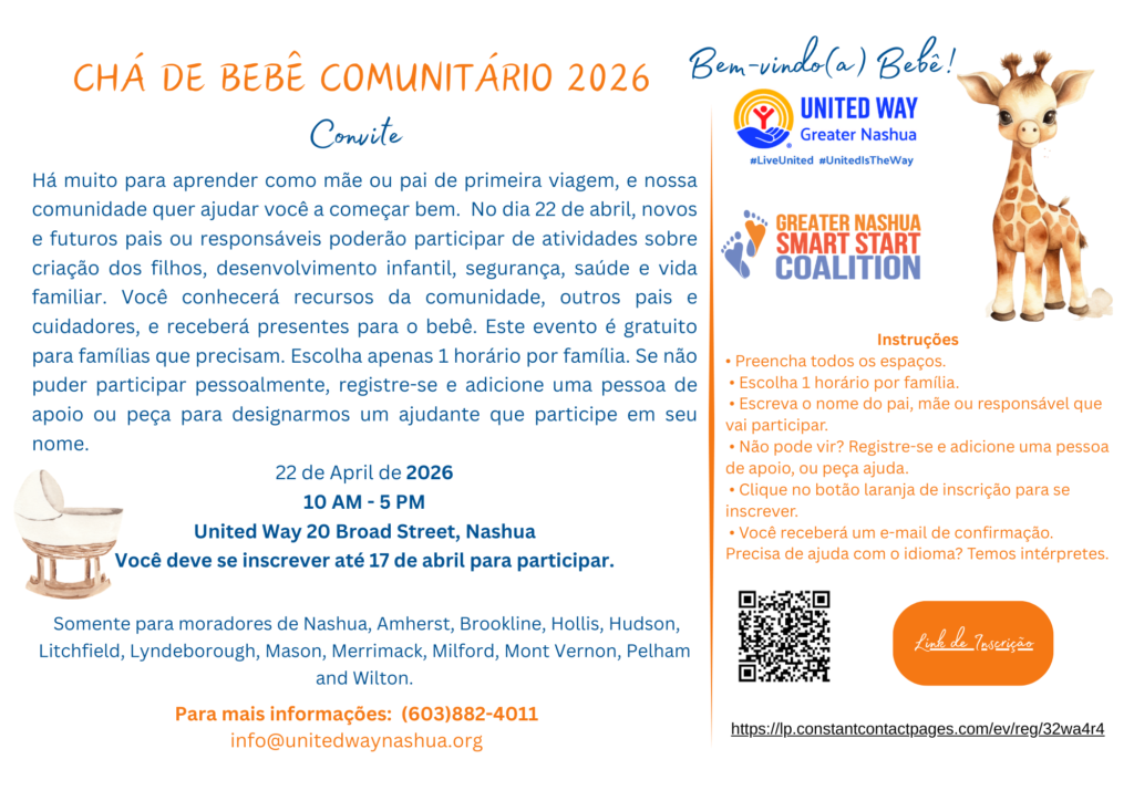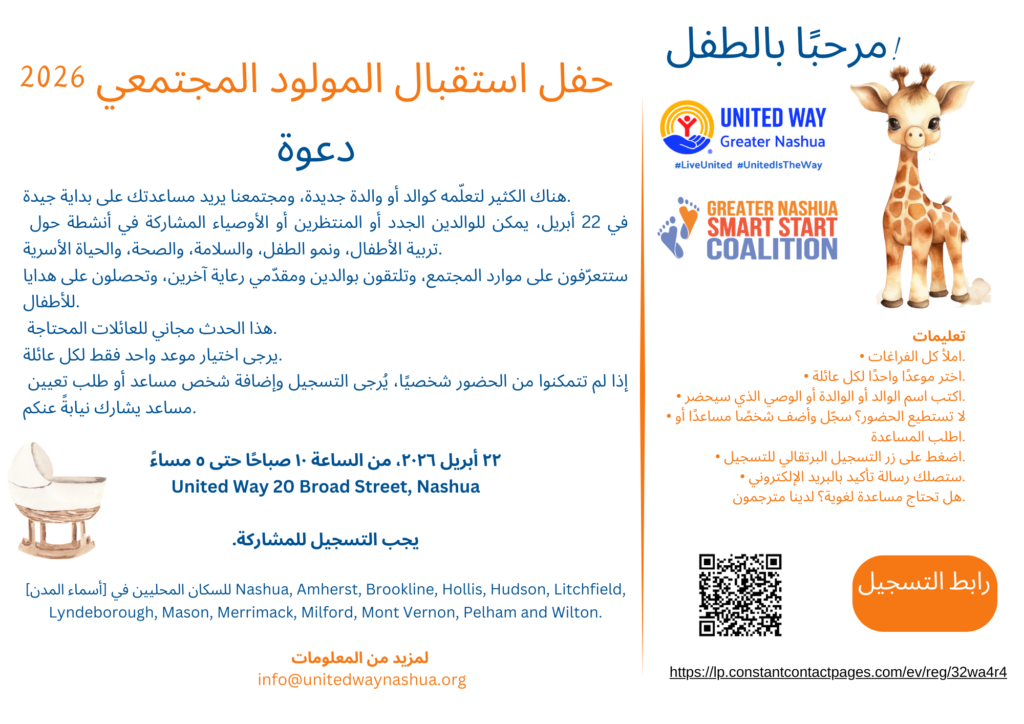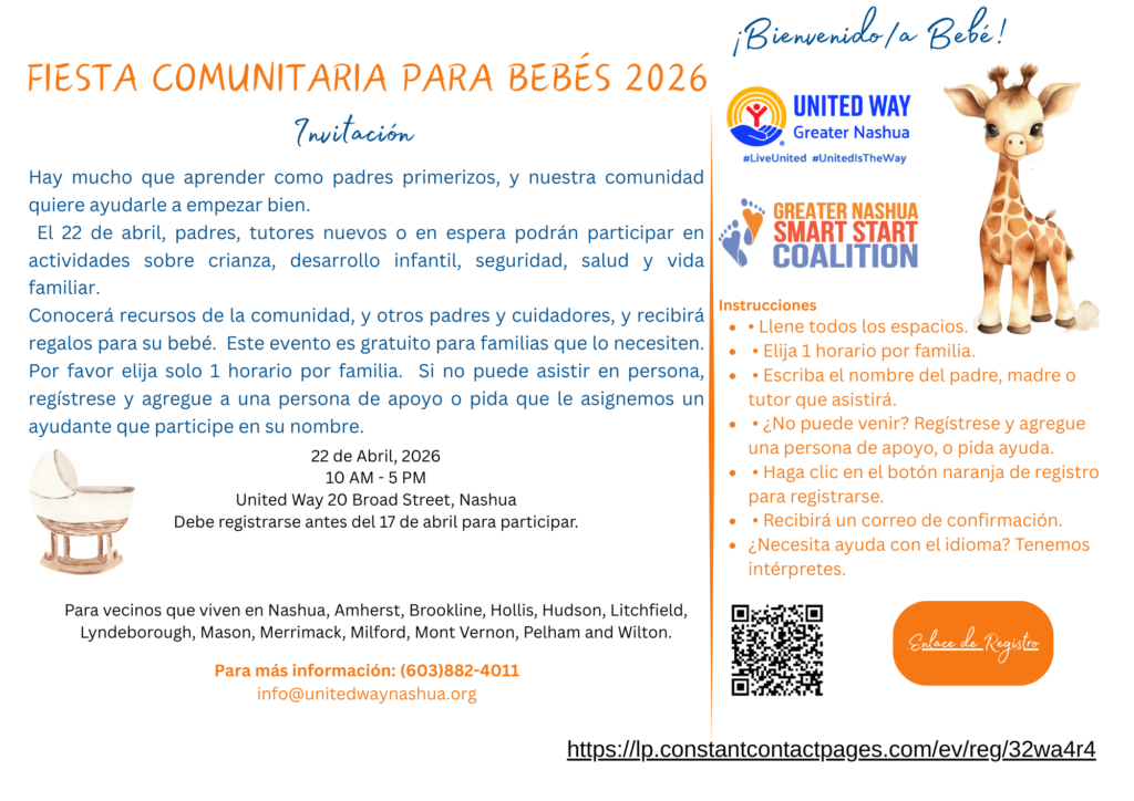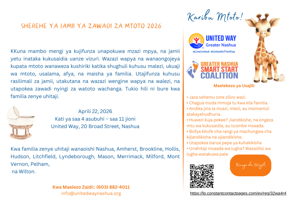 If you know a family in need of help expecting a new baby or has an infant 18 months or younger living in the Greater Nashua Public Health region which includes Nashua, Brookline, Hollis, Hudson, Litchfield, Lyndeborough, Mason, Merrimack, Milford, Mont Vernon, Pelham, and WIlton. (I’m afraid we do not have the capacity to help parents outside of our region but check with your 211 for referals to similar supports for new families available in your region.) Print or download an invitation below. available in English, Spanish, KiSwahili Portuguese (Brazilian) and Modern Arabic